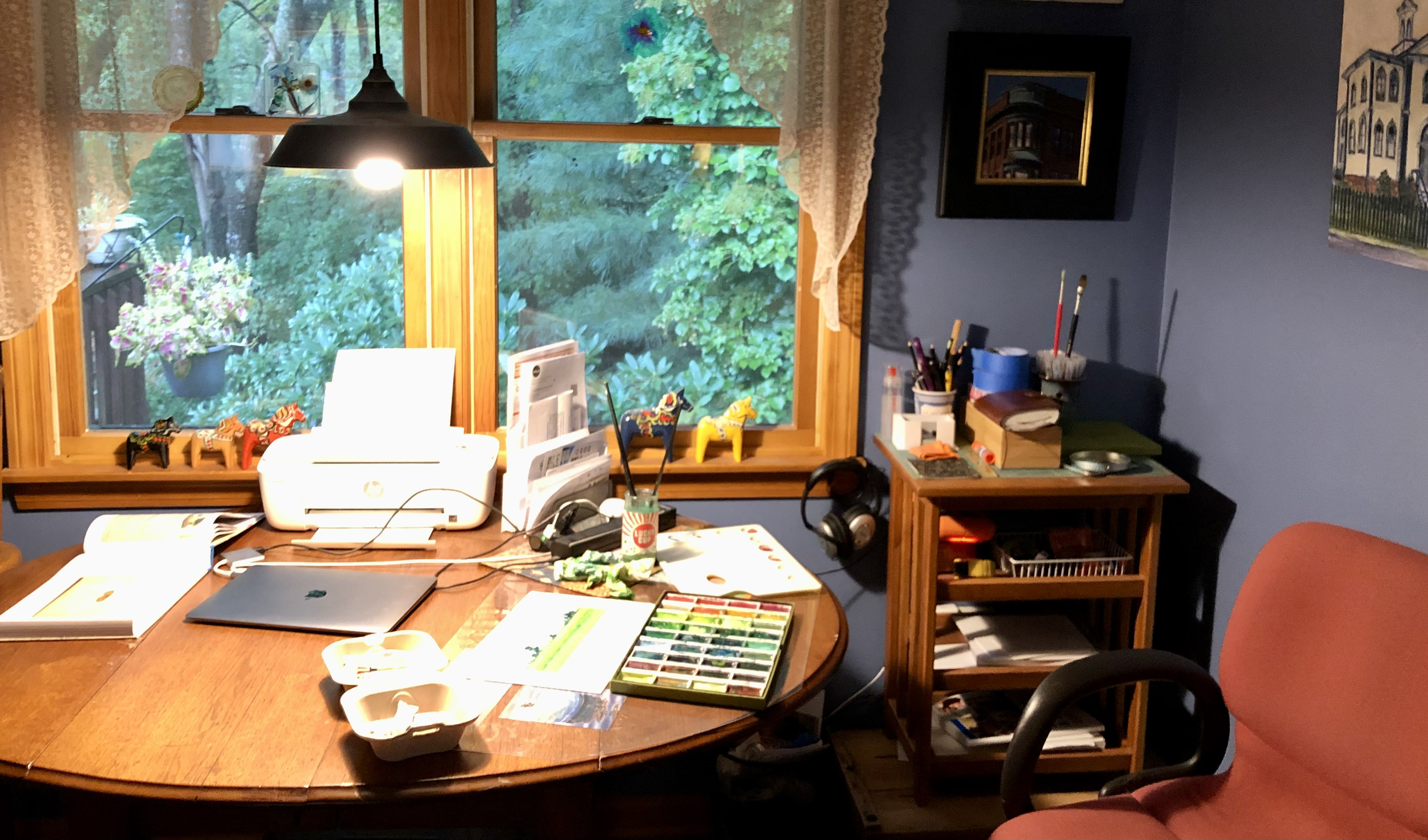 Yes, I’ve expanded my workspace…in a manner of speaking. Due to extenuating circumstances, I had begun to find it difficult to utilize my former studio space to its fullest, so I had to make some changes. In my case, it was an easy fix, especially since my recent work has morphed into both smaller dimensions and a less cumbersome medium, that of watercolor. Which came first - the new direction or the workspace? Doesn’t really matter. The fact is we all adapt and roll with the punches in life, and this was no different. My living space has a solid table right next to a view of the back woods and bird feeders. So here I toil now, comfortable and but a few steps from my bed and coffeemaker. I can stop for a nap…or a caffeine fix. And, when the time is right, my old, more “remote” studio sits right below me, ready to welcome me back.